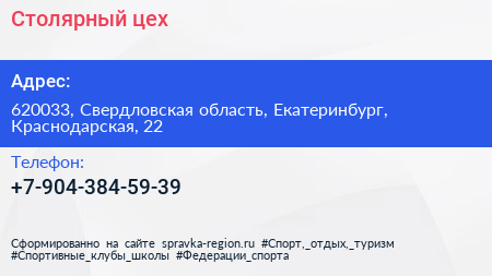 Столярный цех по адресу 620033, Свердловская область, Екатеринбург, Краснодарская, 22 в дальнейшем Организация, размещена в следующих категориях: