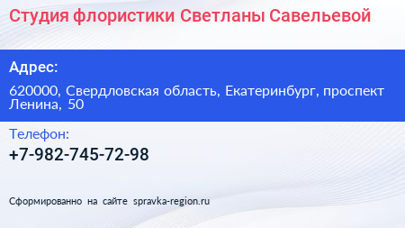 Студия флористики Светланы Савельевой по адресу 620000, Свердловская область, Екатеринбург, проспект Ленина, 50 в дальнейшем Организация, размещена в следующих категориях: