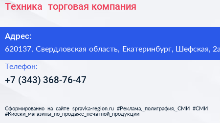 Техника+, торговая компания по адресу 620137, Свердловская область, Екатеринбург, Шефская, 2а в дальнейшем Организация, размещена в следующих категориях: