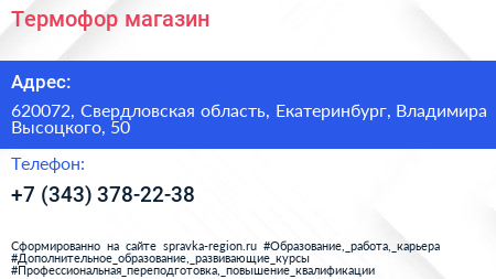 Термофор, магазин по адресу 620072, Свердловская область, Екатеринбург, Владимира Высоцкого, 50 в дальнейшем Организация, размещена в следующих категориях: