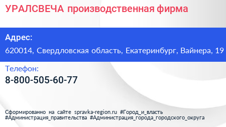 УРАЛСВЕЧА, производственная фирма по адресу 620014, Свердловская область, Екатеринбург, Вайнера, 19 в дальнейшем Организация, размещена в следующих категориях: