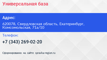Универсальная база по адресу 620078, Свердловская область, Екатеринбург, Комсомольская, 71а/10 в дальнейшем Организация, размещена в следующих категориях: