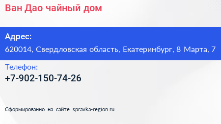 Ван Дао, чайный дом по адресу 620014, Свердловская область, Екатеринбург, 8 Марта, 7 в дальнейшем Организация, размещена в следующих категориях: