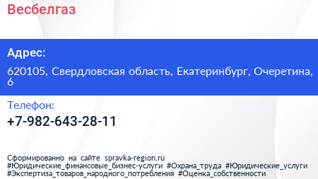Весбелгаз по адресу 620105, Свердловская область, Екатеринбург, Очеретина, 6 в дальнейшем Организация, размещена в следующих категориях: