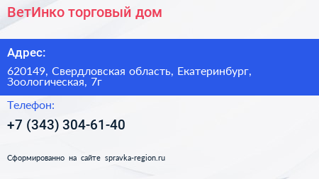 ВетИнко, торговый дом по адресу 620149, Свердловская область, Екатеринбург, Зоологическая, 7г в дальнейшем Организация, размещена в следующих категориях: