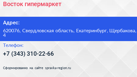 Восток, гипермаркет по адресу 620076, Свердловская область, Екатеринбург, Щербакова, 4 в дальнейшем Организация, размещена в следующих категориях: