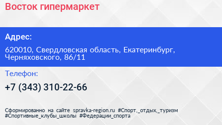 Восток, гипермаркет по адресу 620010, Свердловская область, Екатеринбург, Черняховского, 86/11 в дальнейшем Организация, размещена в следующих категориях: