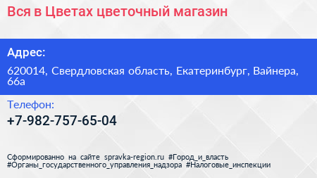 Вся в Цветах, цветочный магазин по адресу 620014, Свердловская область, Екатеринбург, Вайнера, 66а в дальнейшем Организация, размещена в следующих категориях: