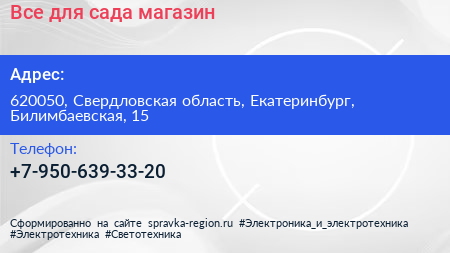 Все для сада, магазин по адресу 620050, Свердловская область, Екатеринбург, Билимбаевская, 15 в дальнейшем Организация, размещена в следующих категориях:
