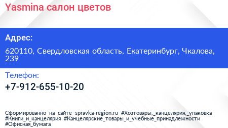 Yasmina, салон цветов по адресу 620110, Свердловская область, Екатеринбург, Чкалова, 239 в дальнейшем Организация, размещена в следующих категориях: