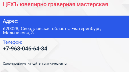 ЦЕХЪ, ювелирно-граверная мастерская по адресу 620028, Свердловская область, Екатеринбург, Мельникова, 3 в дальнейшем Организация, размещена в следующих категориях: