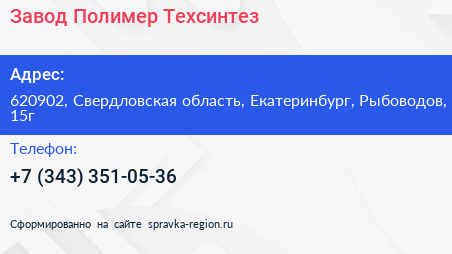 Завод Полимер Техсинтез по адресу 620902, Свердловская область, Екатеринбург, Рыбоводов, 15г в дальнейшем Организация, размещена в следующих категориях: