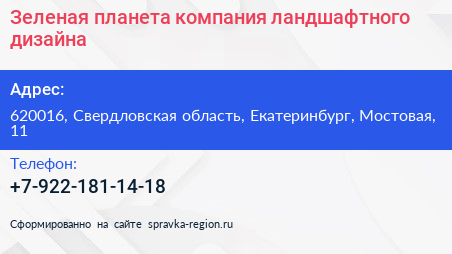 Зеленая планета, компания ландшафтного дизайна по адресу 620016, Свердловская область, Екатеринбург, Мостовая, 11 в дальнейшем Организация, размещена в следующих категориях: