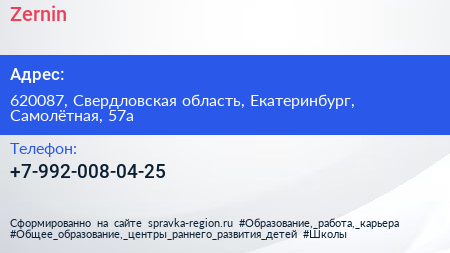 Zernin по адресу 620087, Свердловская область, Екатеринбург, Самолётная, 57а в дальнейшем Организация, размещена в следующих категориях: