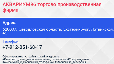 АКВАРИУМ96, торгово-производственная фирма по адресу 620007, Свердловская область, Екатеринбург, Латвийская, 41 в дальнейшем Организация, размещена в следующих категориях: