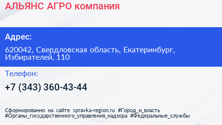 АЛЬЯНС АГРО, компания по адресу 620042, Свердловская область, Екатеринбург, Избирателей, 110 в дальнейшем Организация, размещена в следующих категориях: