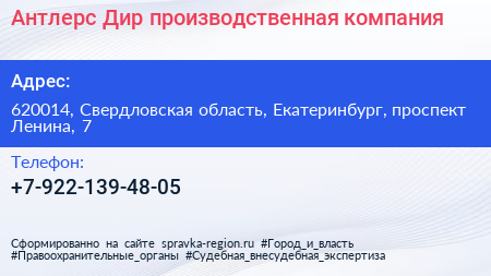 Антлерс Дир, производственная компания по адресу 620014, Свердловская область, Екатеринбург, проспект Ленина, 7 в дальнейшем Организация, размещена в следующих категориях:
