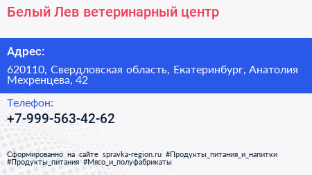 Белый Лев, ветеринарный центр по адресу 620110, Свердловская область, Екатеринбург, Анатолия Мехренцева, 42 в дальнейшем Организация, размещена в следующих категориях: