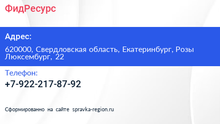 ФидРесурс по адресу 620000, Свердловская область, Екатеринбург, Розы Люксембург, 22 в дальнейшем Организация, размещена в следующих категориях: