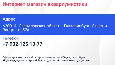 Интернет-магазин аквариумистики по адресу 620014, Свердловская область, Екатеринбург, Сакко и Ванцетти, 57а в дальнейшем Организация, размещена в следующих категориях: