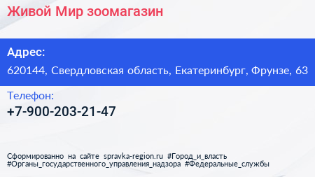 Живой Мир, зоомагазин по адресу 620144, Свердловская область, Екатеринбург, Фрунзе, 63 в дальнейшем Организация, размещена в следующих категориях:
