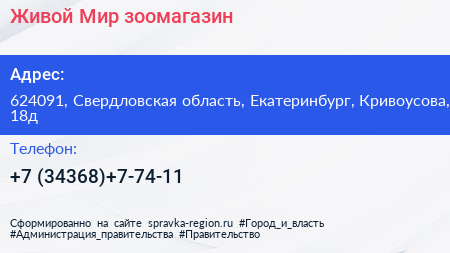 Живой Мир, зоомагазин по адресу 624091, Свердловская область, Екатеринбург, Кривоусова, 18д в дальнейшем Организация, размещена в следующих категориях: