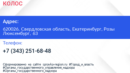 КОЛОС по адресу 620026, Свердловская область, Екатеринбург, Розы Люксембург, 63 в дальнейшем Организация, размещена в следующих категориях: