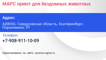 МАРС, приют для бездомных животных по адресу 620010, Свердловская область, Екатеринбург, Пархоменко, 97 в дальнейшем Организация, размещена в следующих категориях: