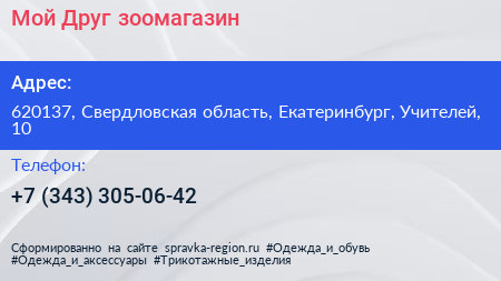 Мой Друг, зоомагазин по адресу 620137, Свердловская область, Екатеринбург, Учителей, 10 в дальнейшем Организация, размещена в следующих категориях: