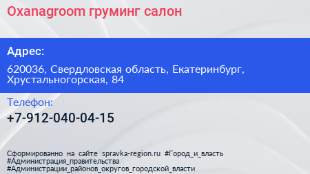 Oxanagroom, груминг-салон по адресу 620036, Свердловская область, Екатеринбург, Хрустальногорская, 84 в дальнейшем Организация, размещена в следующих категориях: