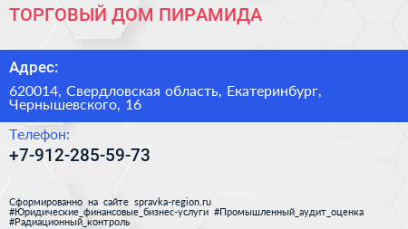 ТОРГОВЫЙ ДОМ ПИРАМИДА по адресу 620014, Свердловская область, Екатеринбург, Чернышевского, 16 в дальнейшем Организация, размещена в следующих категориях: