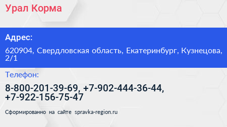 Урал Корма по адресу 620904, Свердловская область, Екатеринбург, Кузнецова, 2/1 в дальнейшем Организация, размещена в следующих категориях: