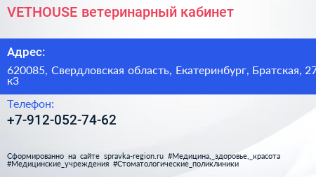 VETHOUSE, ветеринарный кабинет по адресу 620085, Свердловская область, Екатеринбург, Братская, 27 к3 в дальнейшем Организация, размещена в следующих категориях:
