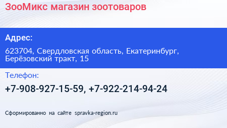 ЗооМикс, магазин зоотоваров по адресу 623704, Свердловская область, Екатеринбург, Берёзовский тракт, 15 в дальнейшем Организация, размещена в следующих категориях: