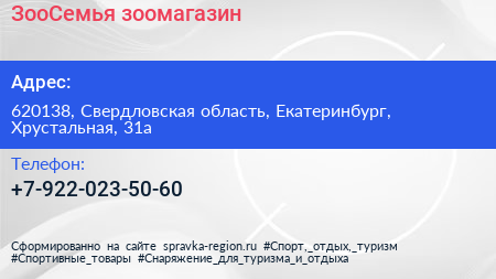 ЗооСемья, зоомагазин по адресу 620138, Свердловская область, Екатеринбург, Хрустальная, 31а в дальнейшем Организация, размещена в следующих категориях: