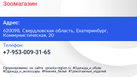 Зоомагазин по адресу 620098, Свердловская область, Екатеринбург, Коммунистическая, 20 в дальнейшем Организация, размещена в следующих категориях: