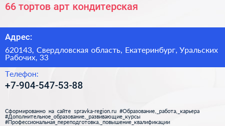 66 тортов, арт-кондитерская по адресу 620143, Свердловская область, Екатеринбург, Уральских Рабочих, 33 в дальнейшем Организация, размещена в следующих категориях:
