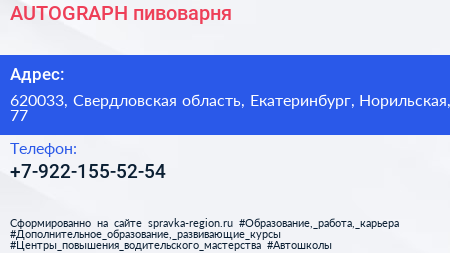 AUTOGRAPH, пивоварня по адресу 620033, Свердловская область, Екатеринбург, Норильская, 77 в дальнейшем Организация, размещена в следующих категориях: