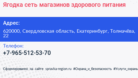 Ягодка, сеть магазинов здорового питания по адресу 620000, Свердловская область, Екатеринбург, Толмачёва, 22 в дальнейшем Организация, размещена в следующих категориях: