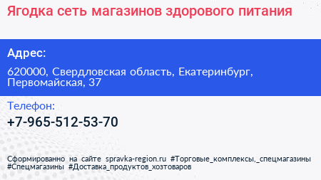 Ягодка, сеть магазинов здорового питания по адресу 620000, Свердловская область, Екатеринбург, Первомайская, 37 в дальнейшем Организация, размещена в следующих категориях:
