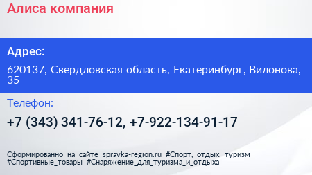 Алиса, компания по адресу 620137, Свердловская область, Екатеринбург, Вилонова, 35 в дальнейшем Организация, размещена в следующих категориях: