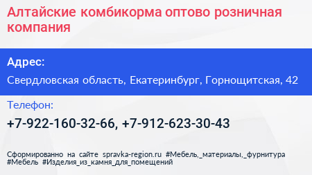 Алтайские комбикорма, оптово-розничная компания по адресу Свердловская область, Екатеринбург, Горнощитская, 42 в дальнейшем Организация, размещена в следующих категориях:
