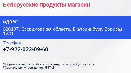 Белорусские продукты, магазин по адресу 620137, Свердловская область, Екатеринбург, Боровая, 19/3 в дальнейшем Организация, размещена в следующих категориях: