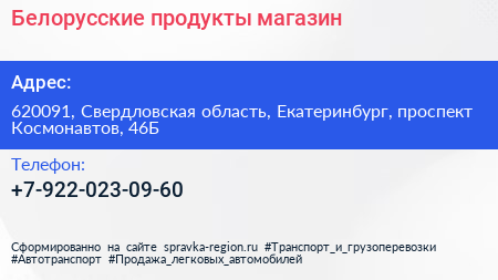 Белорусские продукты, магазин по адресу 620091, Свердловская область, Екатеринбург, проспект Космонавтов, 46Б в дальнейшем Организация, размещена в следующих категориях: