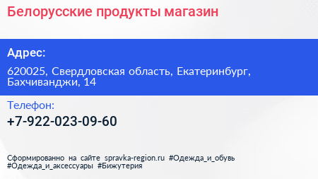 Белорусские продукты, магазин по адресу 620025, Свердловская область, Екатеринбург, Бахчиванджи, 14 в дальнейшем Организация, размещена в следующих категориях: