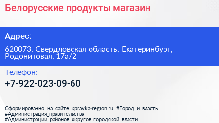 Белорусские продукты, магазин по адресу 620073, Свердловская область, Екатеринбург, Родонитовая, 17а/2 в дальнейшем Организация, размещена в следующих категориях: