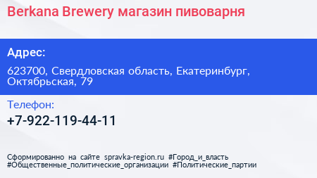 Berkana Brewery, магазин-пивоварня по адресу 623700, Свердловская область, Екатеринбург, Октябрьская, 79 в дальнейшем Организация, размещена в следующих категориях: