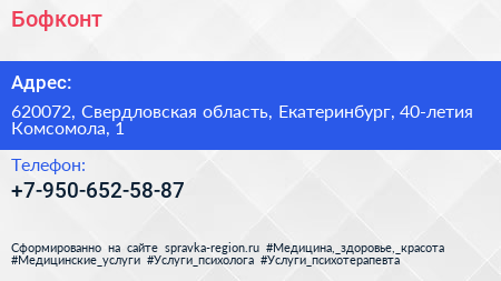 Бофконт по адресу 620072, Свердловская область, Екатеринбург, 40-летия Комсомола, 1 в дальнейшем Организация, размещена в следующих категориях: