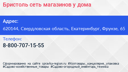 Бристоль, сеть магазинов у дома по адресу 620144, Свердловская область, Екатеринбург, Фрунзе, 65 в дальнейшем Организация, размещена в следующих категориях: