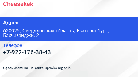 Cheesekek по адресу 620025, Свердловская область, Екатеринбург, Бахчиванджи, 2 в дальнейшем Организация, размещена в следующих категориях: